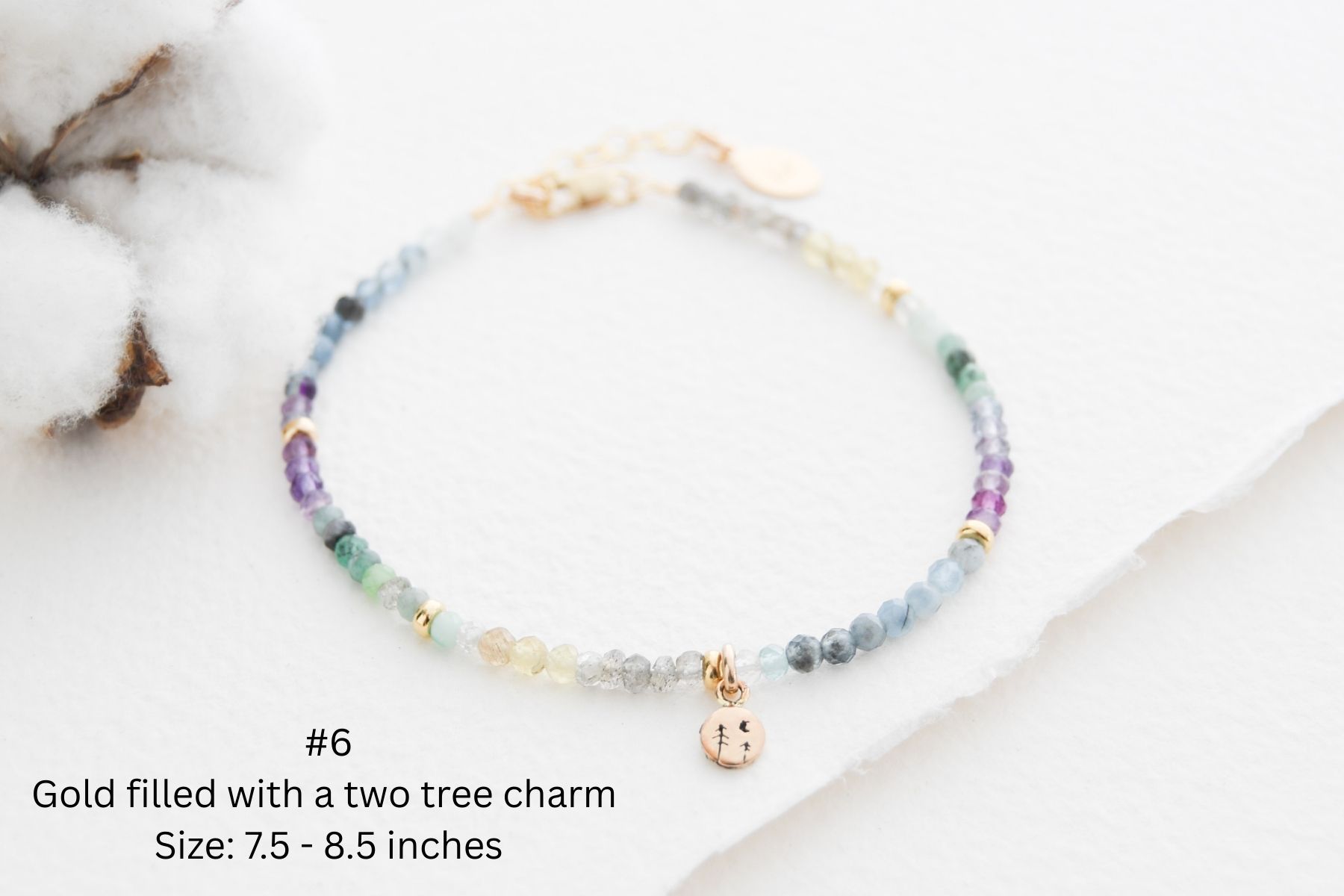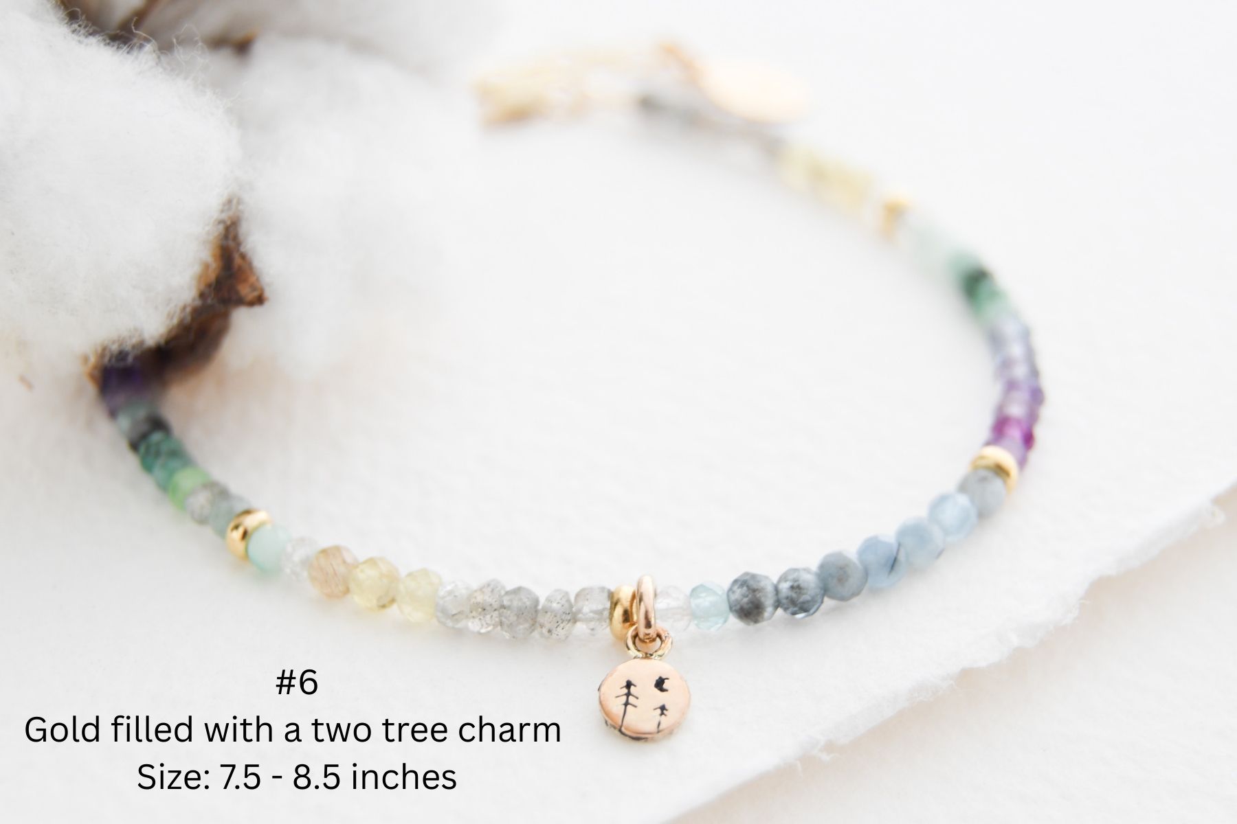 These gemstone nature bracelets are delicate but make a big statement. Made from a variety of semi precious gemstones such as: emerald, amethyst, moonstone, labradorite, fluorite, zircon, watermelon tourmaline, green apatite, pink opal, yellow apatite, and aquamarine (most bracelets have a combination of these gemstones but not all gemstones have been used on each bracelet). Little accent beads have been added to the bracelet to complement the little nature charm. Please note the gold filled and rose gold filled nature charms have sterling silver backings. You will receive the exact bracelet you pick. Bracelet sizes are included on the picture. Pictures have been enhanced to show detail and due to monitor differences colours might be slightly different than pictured.
