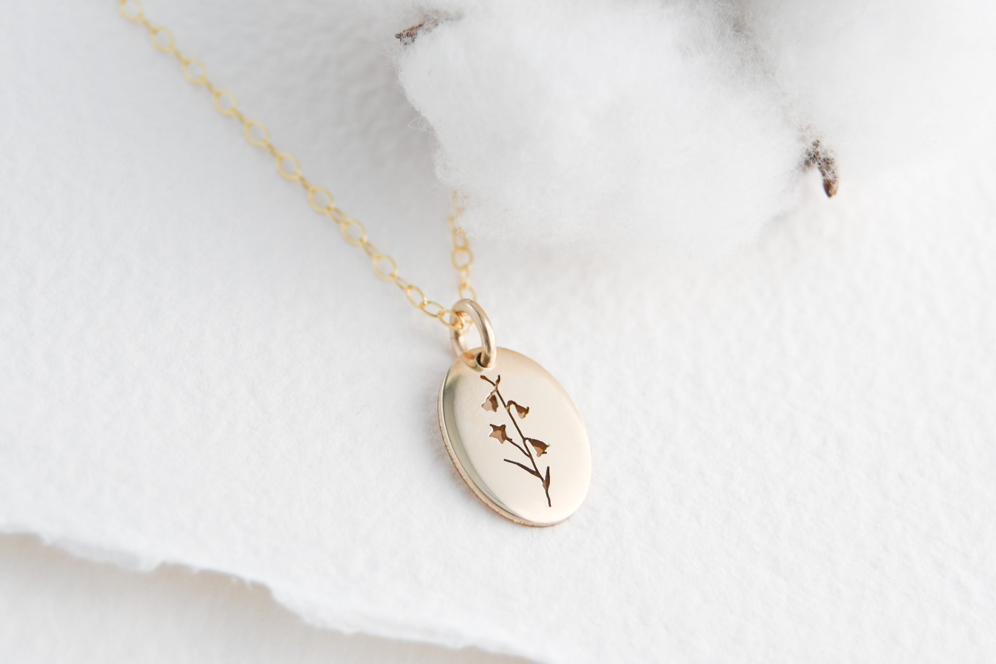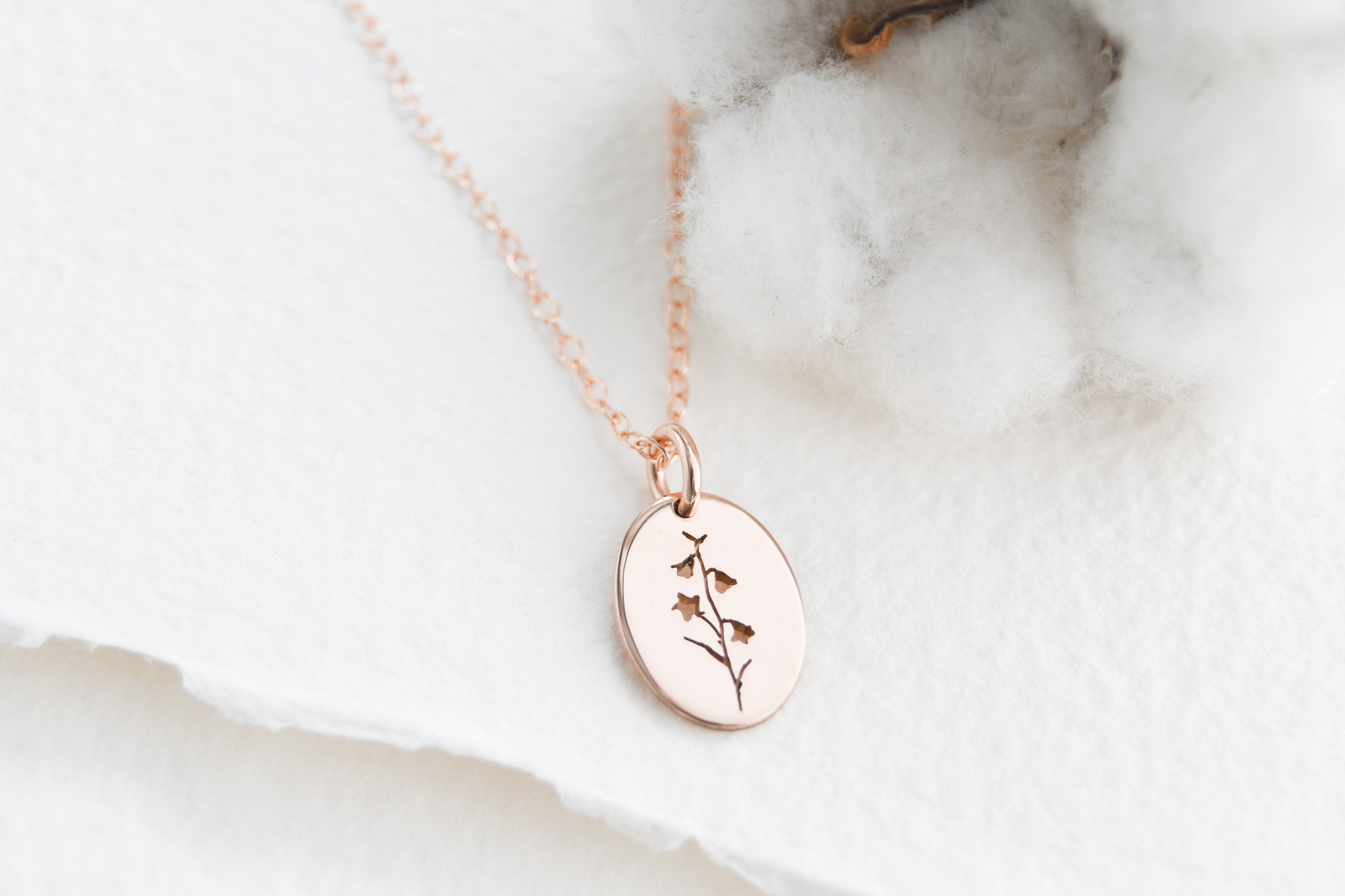 A delicately hand cut beautiful harebell wildflower necklace. Delicate, but hardly, these little flowers can be found throughout Alberta. They carry a symbol of consistency and everlasting love.